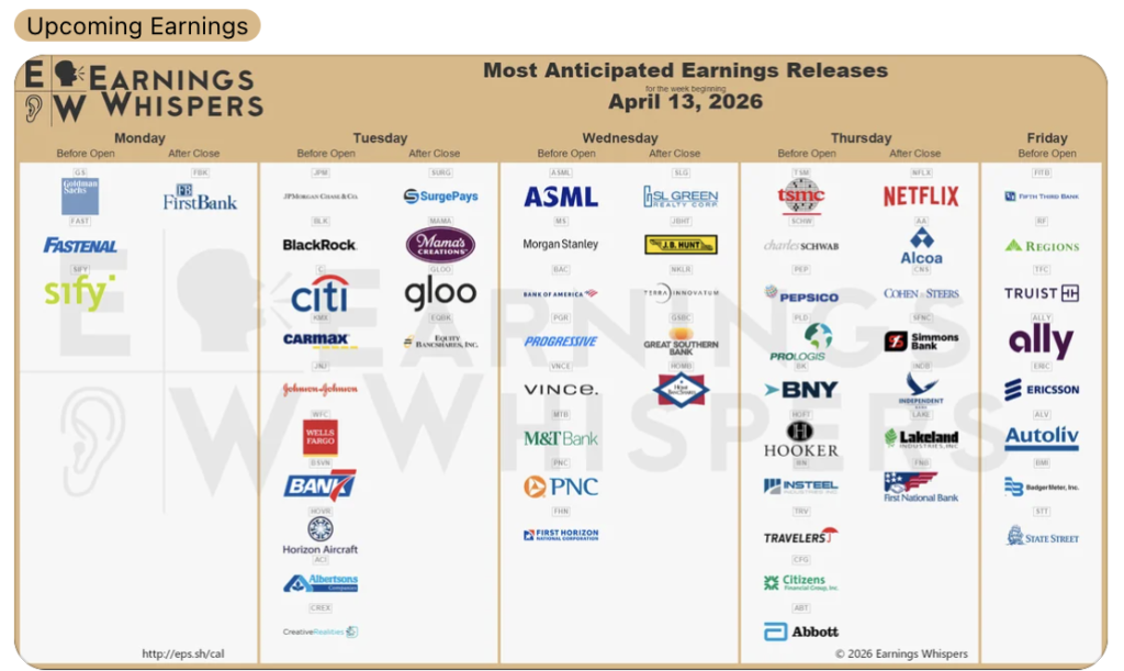 - Major banks will report earnings first, including JPMorgan Chase and Goldman Sachs. The market will focus on loan profitability under high interest rates, investment banking performance, and credit quality (bad loans). This phase typically sets the tone for the entire earnings season.