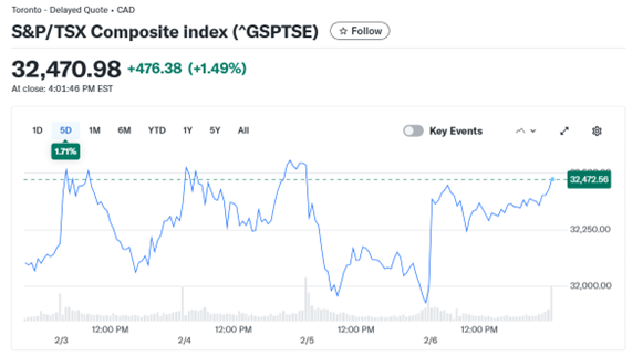 the S&P/TSX Composite Index moved higher, ending the week at 32,470.98, up 1.71%, reflecting broadly positive equity performance across North American markets.