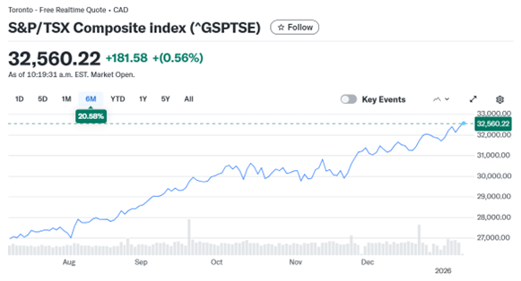 加拿大股市上周整体走强,S&P/TSX 指数收于 32,612.93。指数延续了 2026 年以来的积极走势,市场上涨基础较为广泛,投资者继续重点配置商品及金融板块,这与能源和原材料价格近期走强的市场环境相一致。整体来看,随着油价和贵金属价格回升,TSX 表现同步改善,资源相关板块获得有力支撑,进一步带动加拿大股市整体表现。