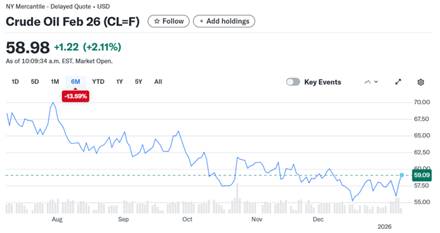 WTI 原油上周收于 $58.78/桶,能源市场持续对地缘政治变化及全球供需格局保持高度敏感,油价走势反映出市场对风险溢价及基本面因素的综合评估。